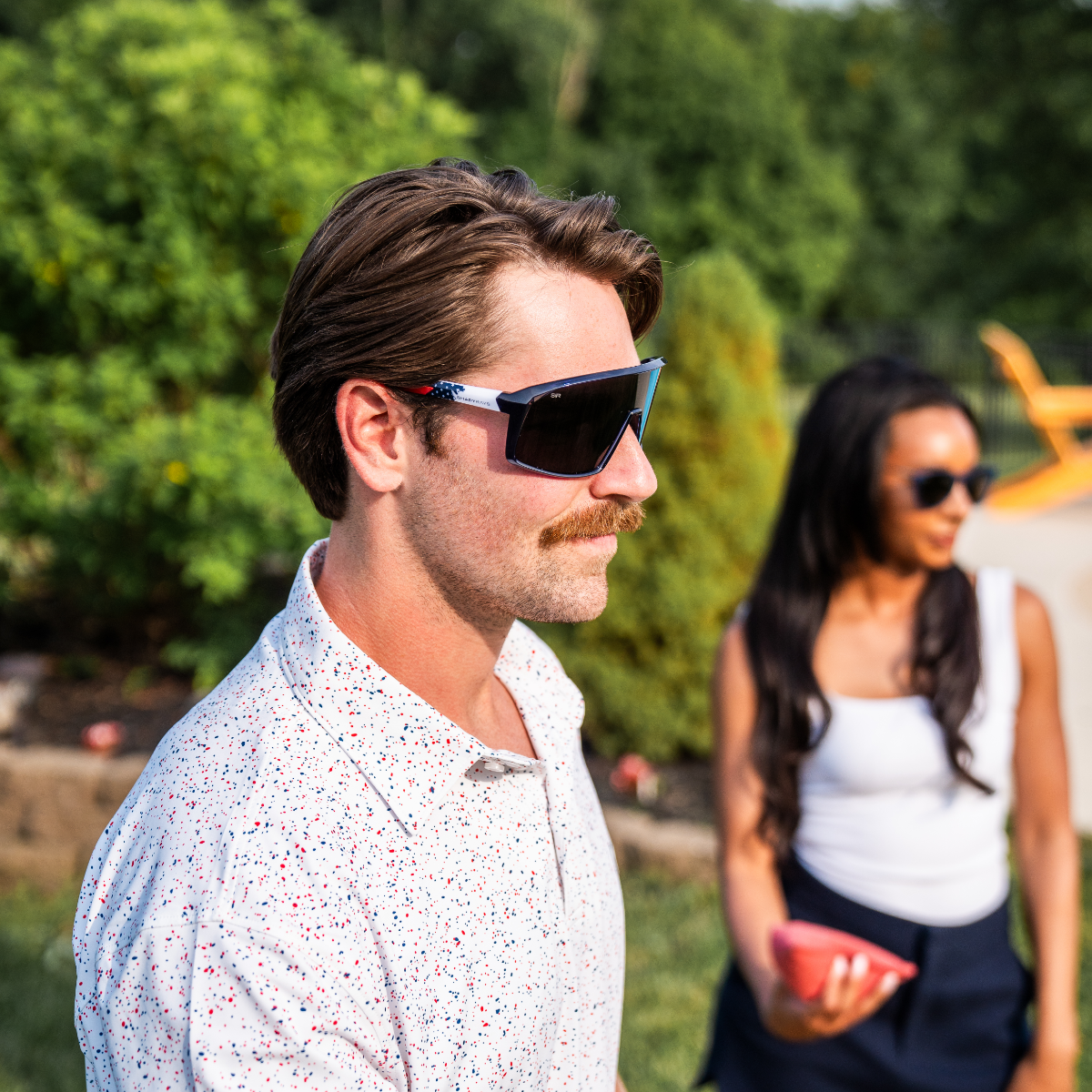 - No-slip design featuring rubber adjustable nose pad. and dual injected American flag temples with air flow sweat channels.